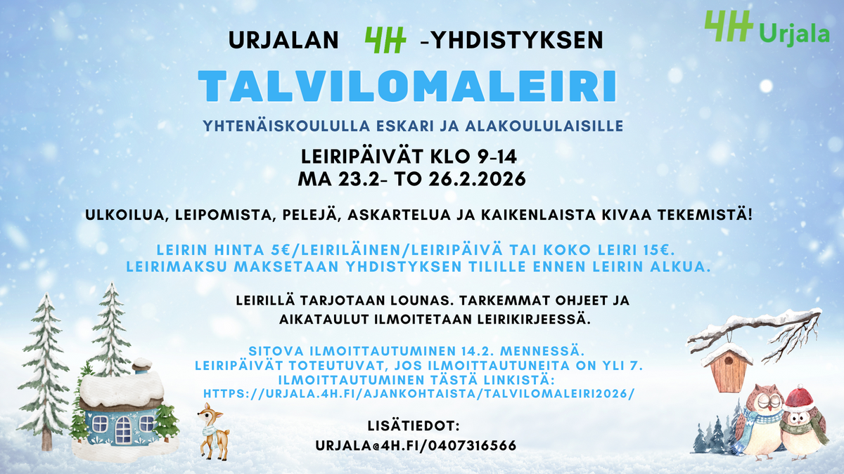 Ilmoittautuminen talvilomaleirille on alkanut! Leirille mahtuu 15 lasta. Leiripaikat täytetään ilmoittautumisjärjestyksessä.